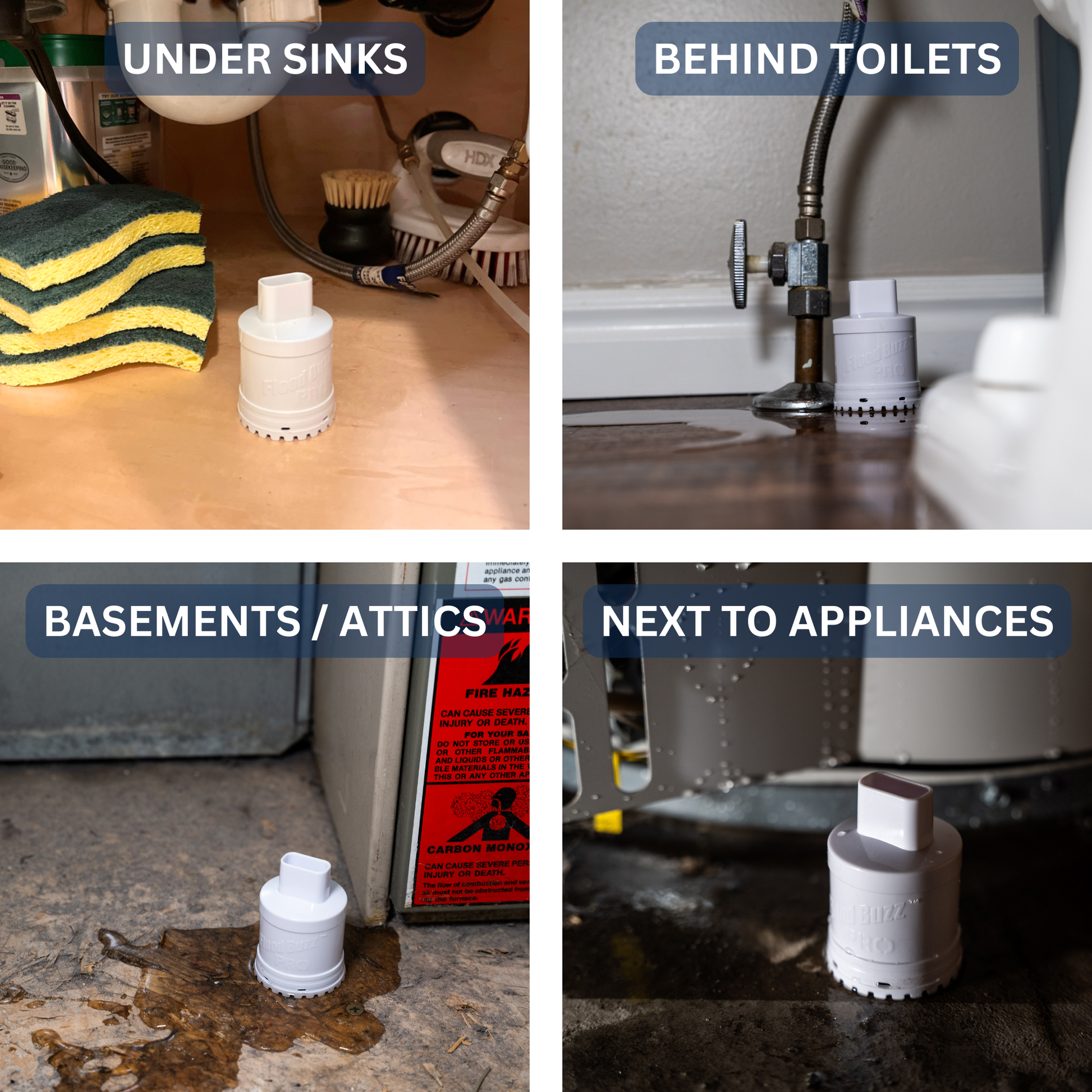 The Flood Buzz® Pro is an all-purpose water leak alarm unit designed for any leaky spot in the home.